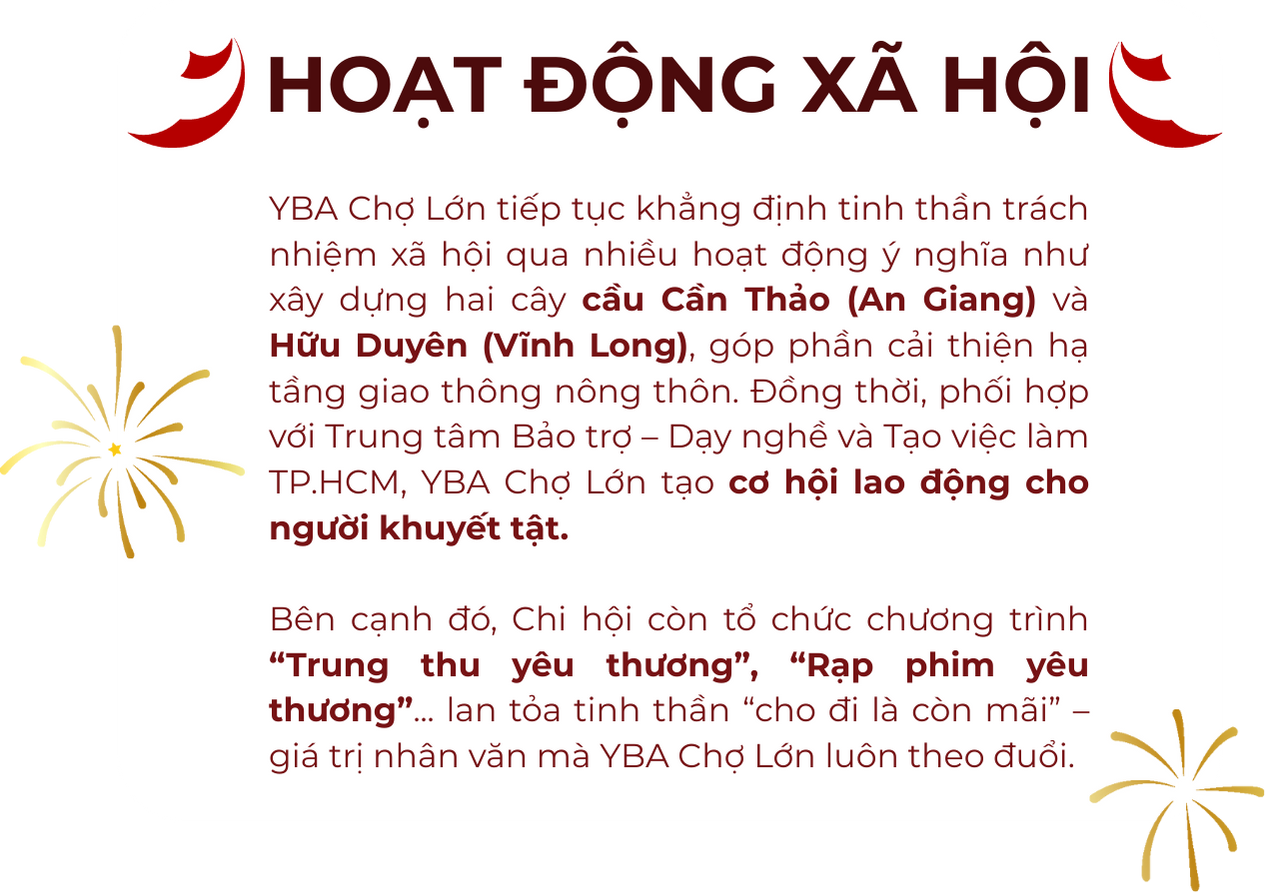 YBA Chợ Lớn tiếp tục khẳng định tinh thần trách nhiệm xã hội qua nhiều hoạt động ý nghĩa như xây dựng hai cây cầu Cần Thảo (An Giang) và Hữu Duyên (Vĩnh Long), góp phần cải thiện hạ tầng giao thông nông thôn. Đồng thời, phối hợp với Trung tâm Bảo trợ – Dạy nghề và Tạo việc làm TP.HCM, YBA Chợ Lớn tạo cơ hội lao động cho người khuyết tật.