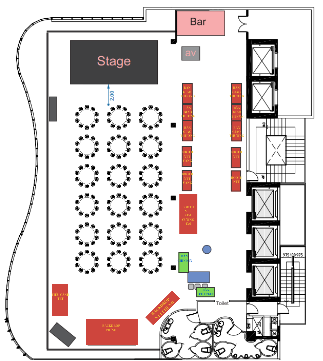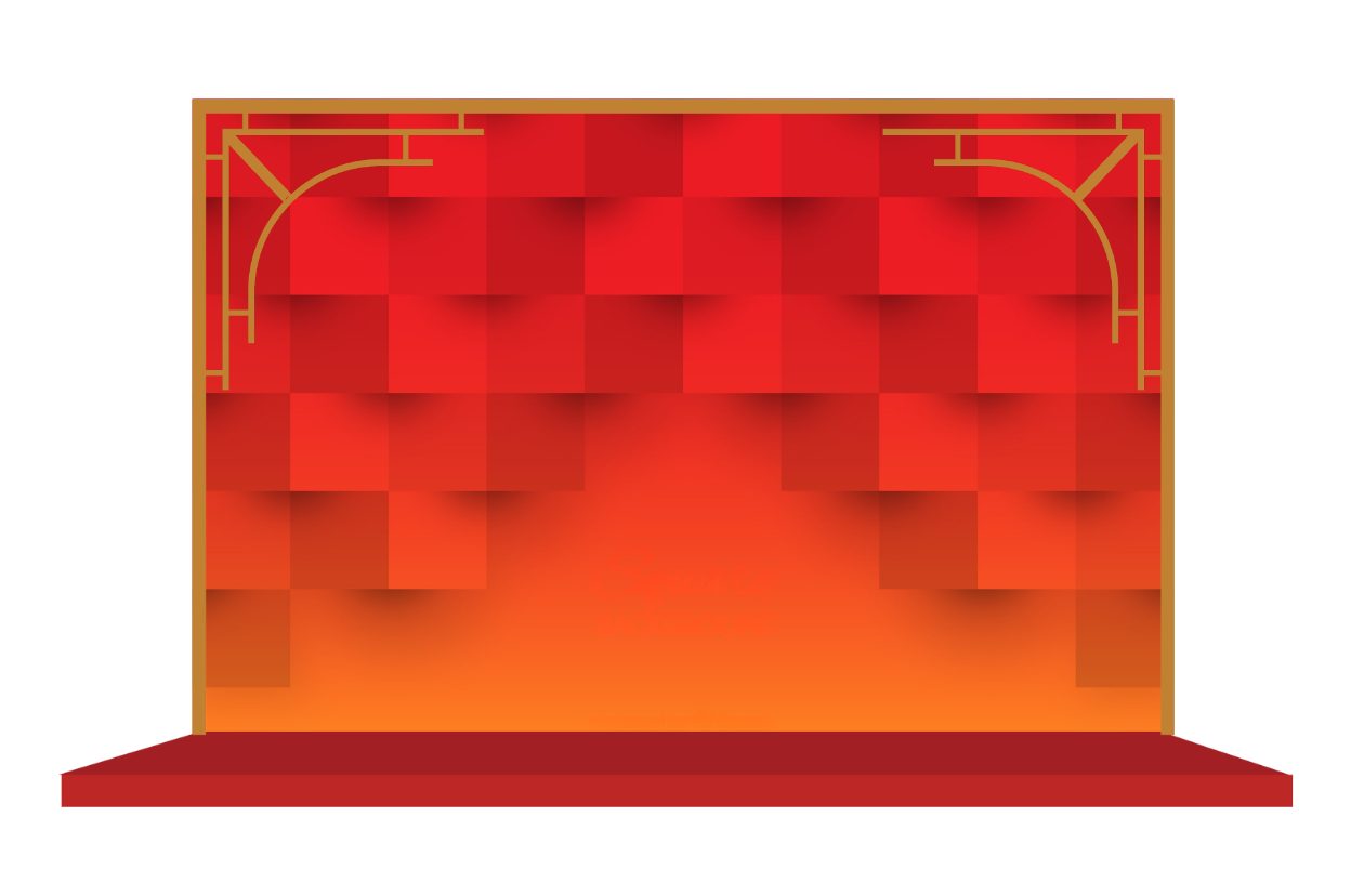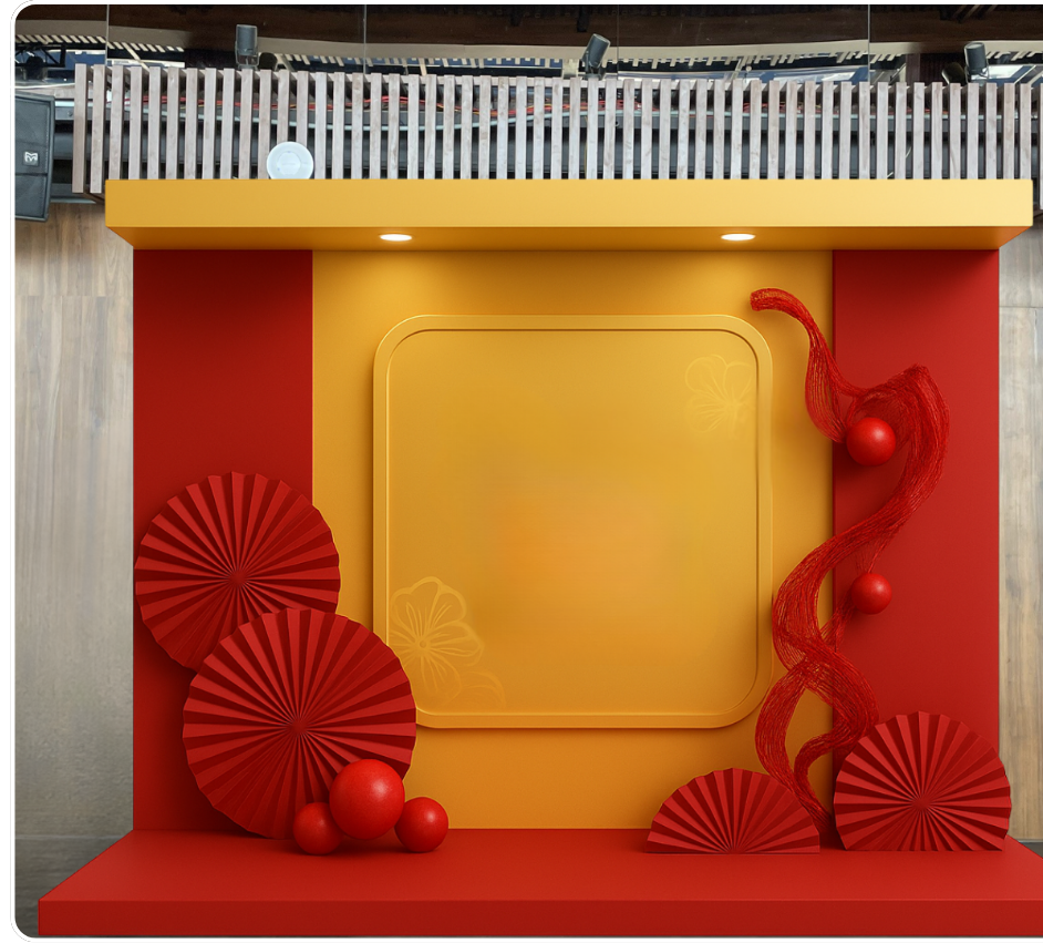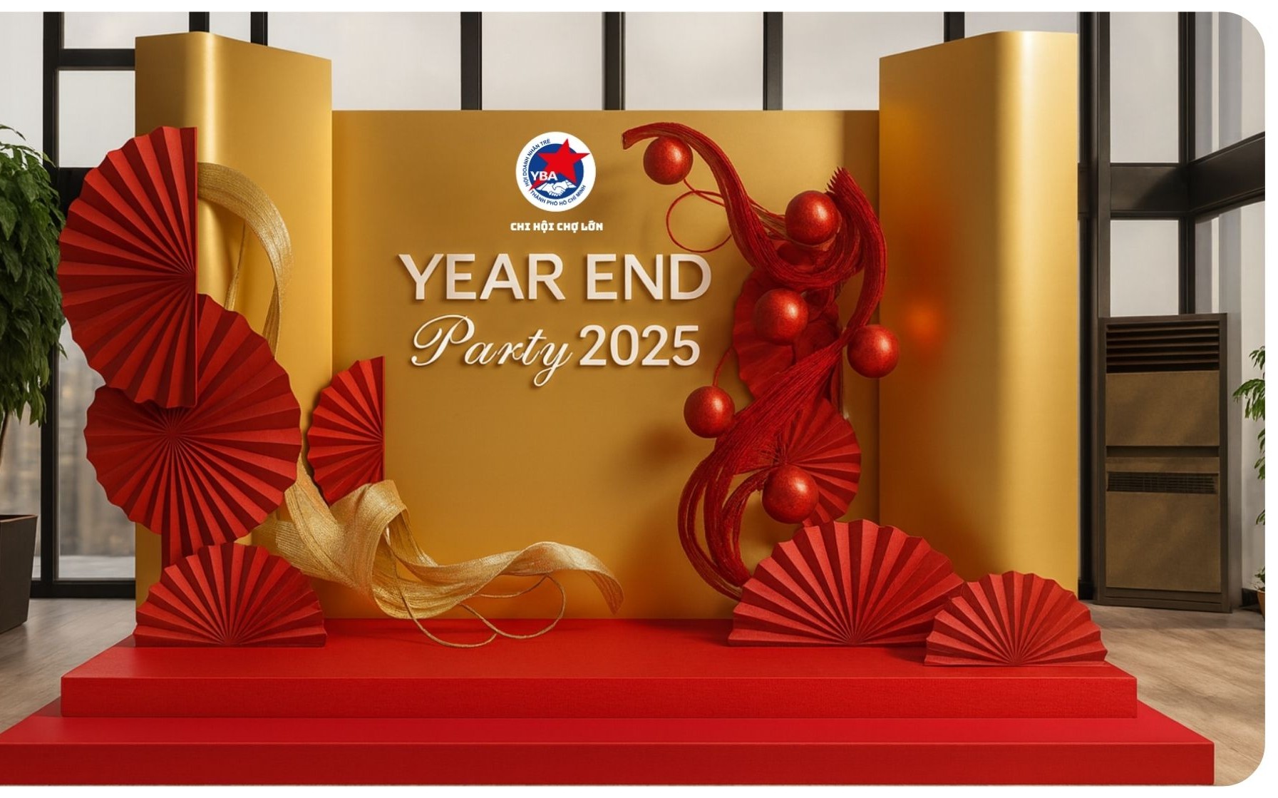 Background chụp hình Year End Party được thiết kế với hai gam màu chủ đạo đỏ – vàng, tạo cảm giác rực rỡ, may mắn và tràn đầy năng lượng cuối năm. Những mảng quạt xếp, dải lụa uốn lượn và các điểm nhấn hình khối đỏ nổi bật giúp không gian trở nên sống động, sang trọng và đầy tính lễ hội. Từng chi tiết được bố trí cân đối, giúp khung hình vừa nổi bật chủ thể vừa giữ được tinh thần tri ân – tôn vinh, rất phù hợp cho một đêm tiệc Year End Party đầy cảm xúc và đẳng cấp.