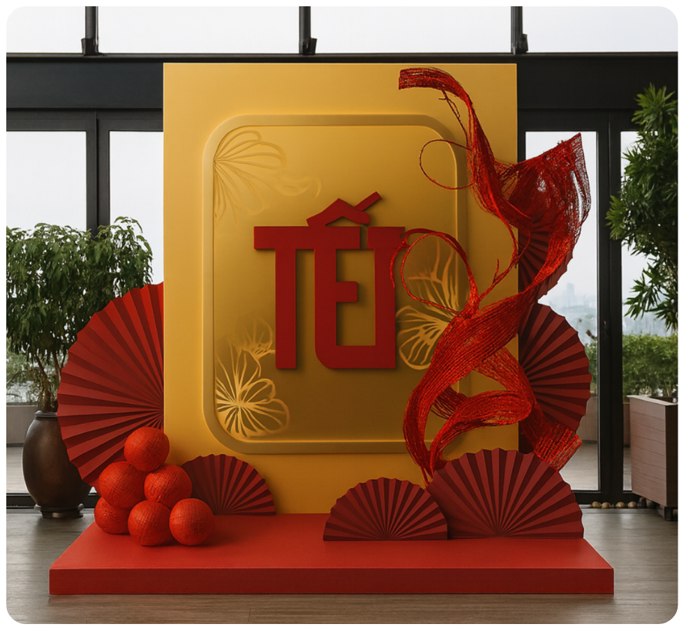 Tiểu cảnh Tết được thiết kế với tông vàng – đỏ chủ đạo, gợi cảm giác ấm áp và thịnh vượng đầu năm. Nền vàng nhẹ điểm họa tiết hoa xuân tạo chiều sâu, nổi bật chữ “TẾT” đỏ đầy năng lượng. Các chi tiết quạt xếp, dây trang trí uốn lượn và cụm bóng đỏ được sắp đặt hài hòa, mang lại không gian vừa truyền thống vừa hiện đại. Đây là background lý tưởng để lưu giữ những khoảnh khắc Tết rộn ràng, may mắn và tràn đầy sức sống.