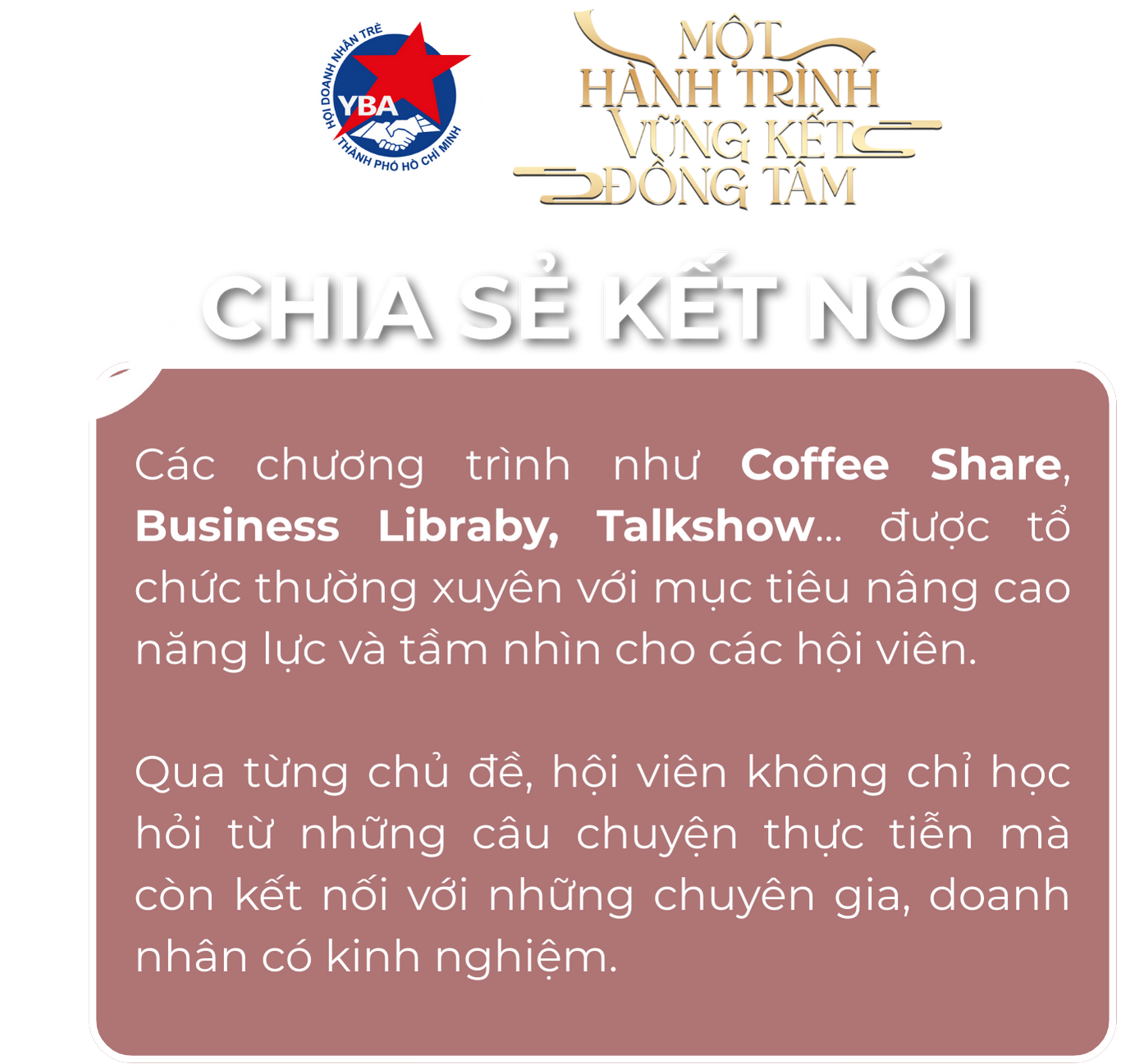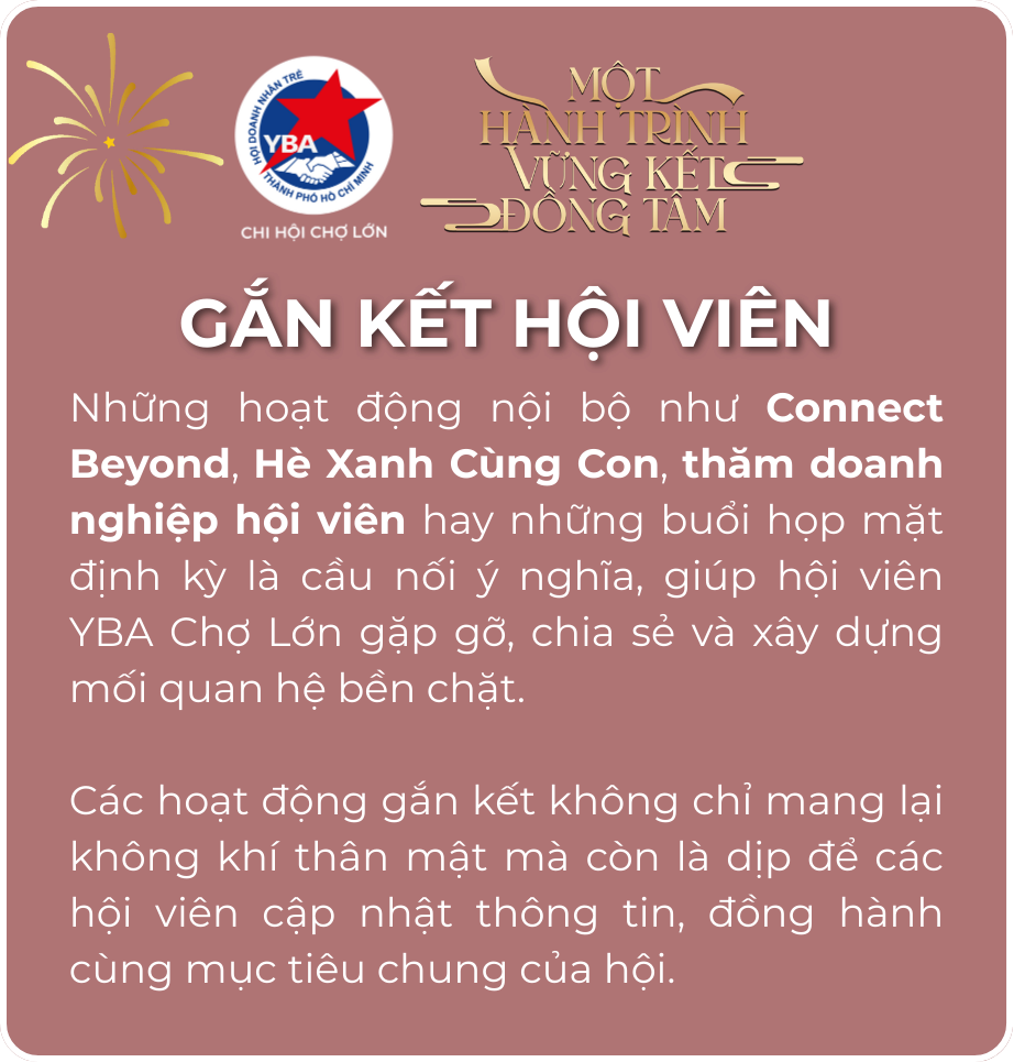 Những hoạt động nội bộ như Connect Beyond, Hè Xanh Cùng Con, thăm doanh nghiệp hội viên hay những buổi họp mặt định kỳ là cầu nối ý nghĩa, giúp hội viên YBA Chợ Lớn gặp gỡ, chia sẻ và xây dựng mối quan hệ bền chặt.